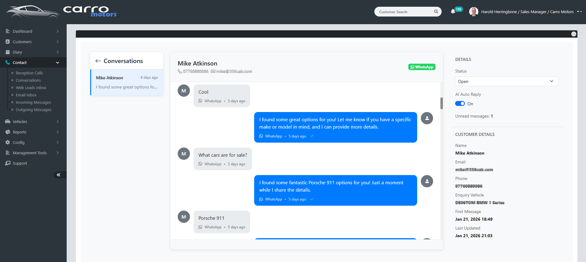 - WhatsApp two-way messaging with AI auto-reply